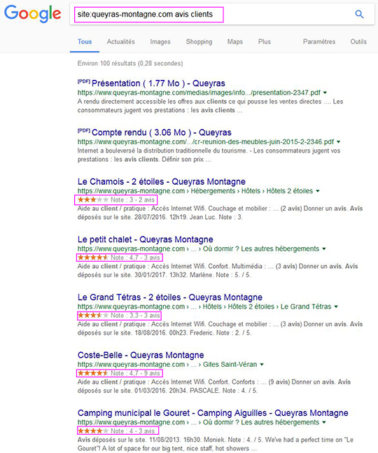 Intégrés avec des balises liées aux avis, Google indexe ces derniers dans ses bases de données et les affiche de manière différenciée sur les résultats de recherche :